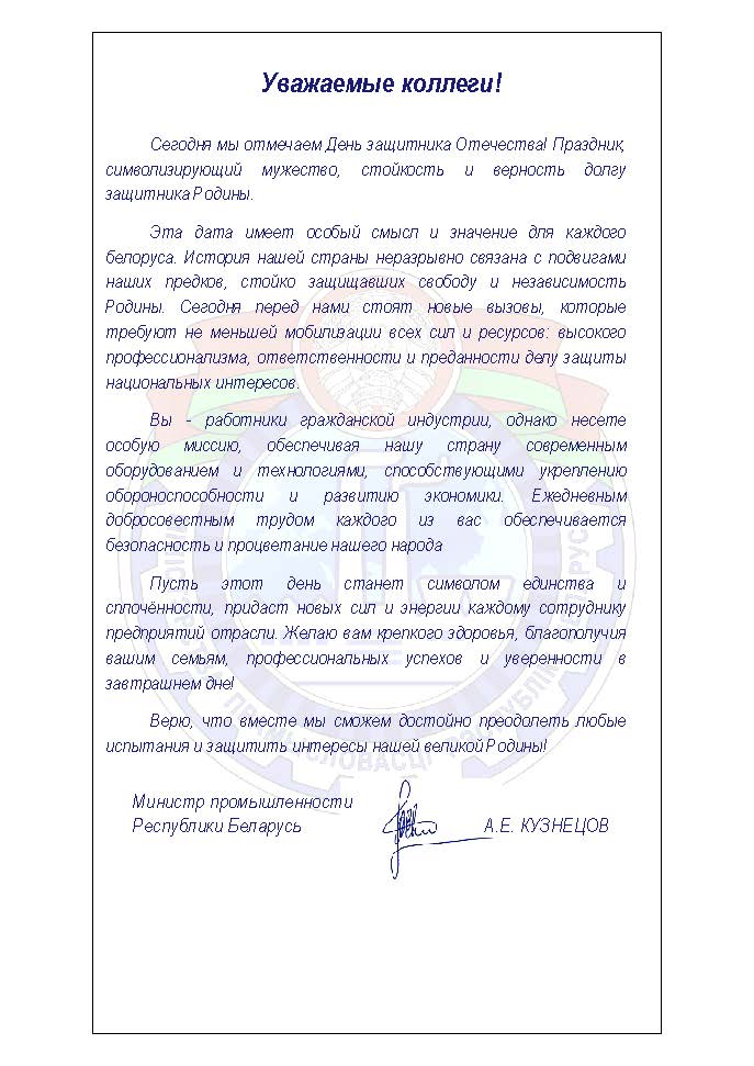 Поздравления Поздравление Министра промышленности А.Е. Кузнецова с Днем защитника Отечества и Вооруженных сил Республики Беларусь 20.02.2026 Опубликовано MZOR 20 Фев